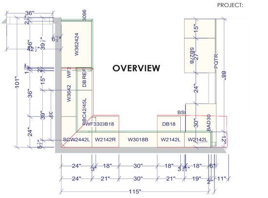 Detailed drawings of floor plan and elevations with measurements illustrating layout with detailed cabinet plans, appliances, electical, lighting and plumbing plans, plumbing fixtures, and budget